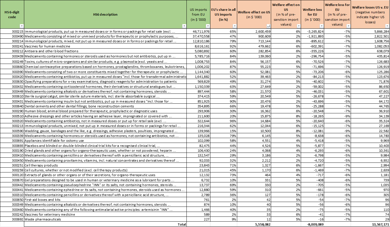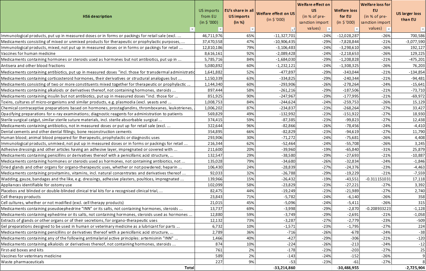 - Interestingly, the economic hit to the US economy exceeds that of the EU, by about $3B (see rightmost column). This can be explained by the fact that in many pharma sectors EU imports make up for a considerable percentage of overall imports (column 4 of Table 1). US consumers cannot easily substitute for lost EU imports by switching to other import sources.